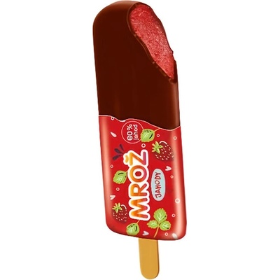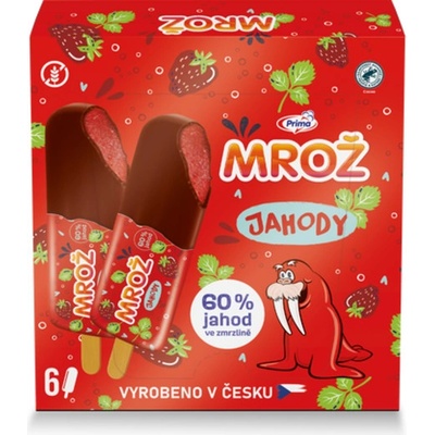 -- Mrož je jedna z našich nejoblíbenějších zmrzlin, v této podobě zahalená do bílé polevy. Za jeho typickou chuť vděčíme porci českého tvarohu zjemněného smetanou a více než 50% pečlivě vybraných vyzrálých jahod. Chuť jahod je to nejdůležitější, proto do Mrože vybíráme...