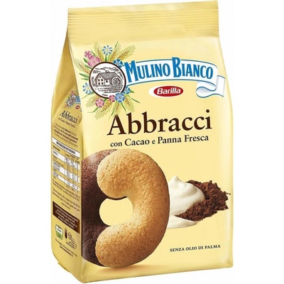 Mulino Bianco Biscotti Abbracci jsou lahodné sušenky, které nabízejí dokonalé spojení krémové smetany a bohaté čokolády. Tyto sušenky mají jedinečný tvar objímky, který symbolizuje harmonii chutí. Ideální kávové nebo čajové doplnění, které potěší každého milovníka...