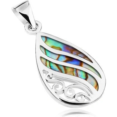 Přívěsek ze stříbra 925, slza zdobená výřezem se spirálami a mušlí abalone, která je rozdělena na tři části lesklými liniemi.