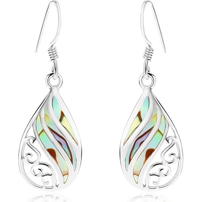Stříbrné 925 náušnice, kapka s výřezem, filigránový ornament, mušle Paua, zvlněné linie, africké háčky.