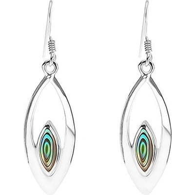 Stříbrné náušnice 925, kontura špičatého zrnka, vložené zrnko vykládané mušlí Paua, africké háčky, zrcadlový lesk.