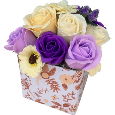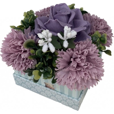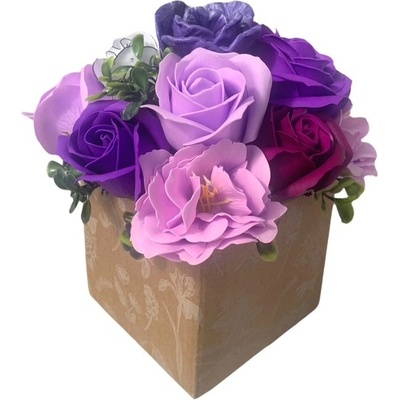 Dekorace Mýdlová kytice v miniboxu Laura Lila aranžováno v papírovém boxu 9x9cm Dekorace obsahuje: tuhé mýdlo růže mýdlové květy karafiátů umělou zelenou dekoraci a...
