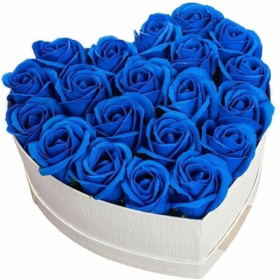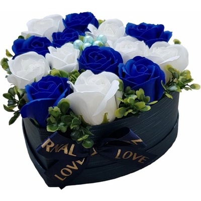 Deorace Mýdlová kytice z mýdlových květů v srdci Blue Ela II aranžováno v papírovém boxu tvaru srdce celková výška 11cm, celková šířka 18cm Dekorace obsahuje : mýdlové...
