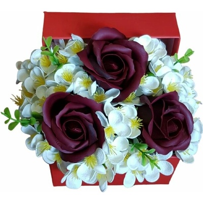 Dekorace Mýdlová kytice Romance v dárkovém boxu 10x10 cm Dekorace obsahuje 1x tuhé mýdlo tvar srdce, 4x mýdlové květy růže střední, 1x mýdlový květ karafiát, 1x mýdlový květ...