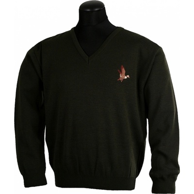 Myslivecký svetr s výstřihem do V. V levé horní části svetru je výšivka kachny divoké. Materiál: 100% akryl