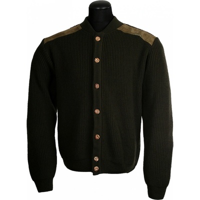 Pletený svetr zelené barvy s výstřihem do V. V horní levé části je plátěná kapsa s výšivkou žaludů. Kapsa se zapíná pomocí suchého zipu. Materiál: 30% vlna, 70% acryl