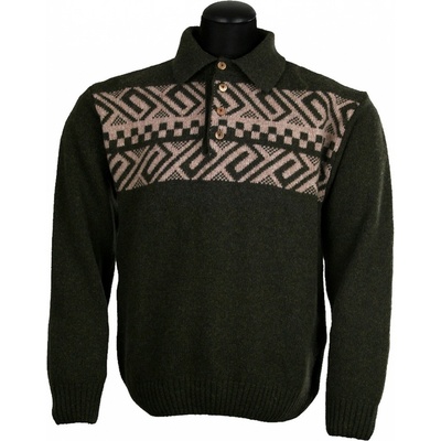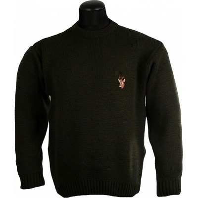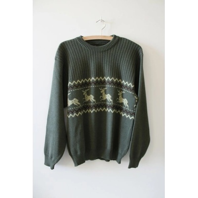 Svetr pletený myslivecký v zeleném provedení s motivem jelenů. Materiál: 50% vlna, 50% polyacryl