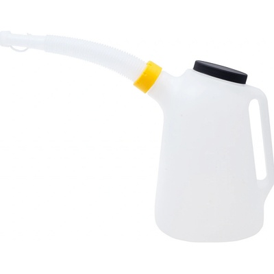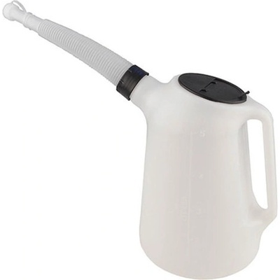 Konev, nádoba (odměrka) na nalévání motorového oleje a provozních kapalin, objem 5 litrů, s víčkem a ohebnou hubicí – QUATROS QS60225 Průsvitná konev na jednoduché a rychlé...
