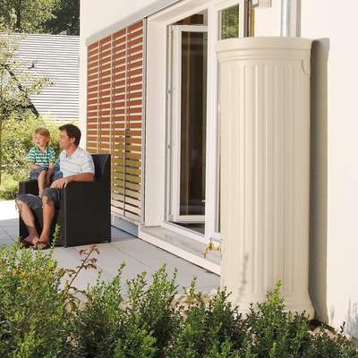Nadzemní designová sloupová nádrž na dešťovou vodu o objemu 1000 l v béžové barvě Nadzemní sloupová nádrž 1000 l béžová: Moderní řešení pro zachycení dešťové vody s praktickým...