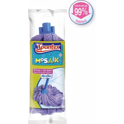 Spontex Mosaik Effective náhradní mop pásky Mop Mosaik náhradní třásňový Spontex hrubý závit Nový MOSAIK mikrovláknový třásňový mop je velmi účinný díky unikátní kombinaci fialových třásní z mikrovlákna a modrých polyesterových proužků v každé třásni. Lze prát v pračce...