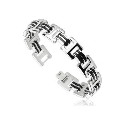 Náramek chirurgická ocel zdobená pryžovými proužky. Délka 22,3 cm. Šířka 13,5 mm. Dodání ihned.