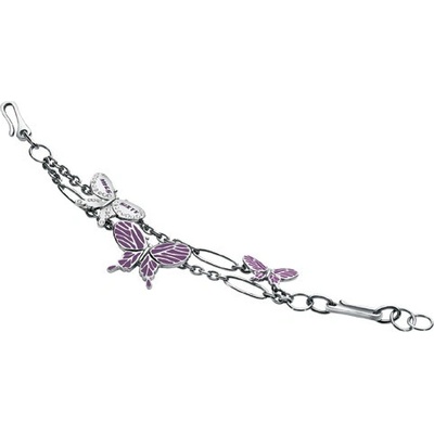 Náramek z chirurgické oceli. Lesklá povrchová úprava. S přívěsky motýlků. Dva motýlci smaltováni, třetí s nápisem Miss Sixty osázen krystaly. Délka náramku 18,5 cm. Největší...
