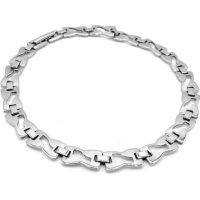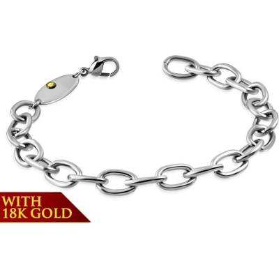 Náramek z lesklé chirurgické oceli. Skládá se z jednoduchých ok. Na destičce je ozdoba z 23K zlata. Šířka 8 mm. Délka 23 cm. Dodání ihned - zboží je skladem.