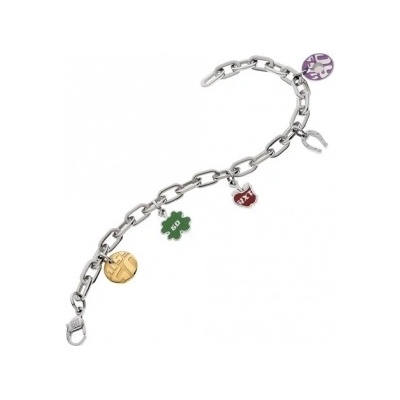 Náramek z chirurgické oceli. Lesklá povrchová úprava. S přívěsky knoflíku, podkovy, jablíčka, čtyřlístku a medailonku. Délka náramku 19 cm. V Dodání ihned, náramek je skladem.