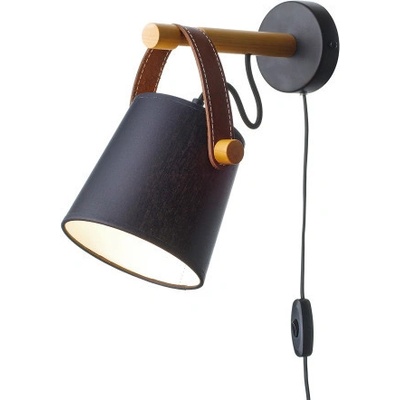Nástěnné svítidlo s originálním koženým řemínkem v moderním stylu. Řemínek visí na dřevěném prvku ve tvaru obdélníka v barvě přírodní olši. Na řemínku uvidíme krásné černé...