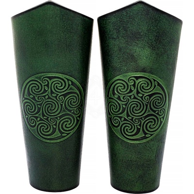 Keltské kožené nátepníky s ražbou spirálového ornamentu Nátepníky jsou ručně vyrobené, což zaručuje jejich originalitu a kvalitu. Jejich délka na svrchní straně je 180 mm, na spodní straně pak 140 mm. Jsou navrženy tak, aby seděly na předloktí o obvodu přibližně 160...