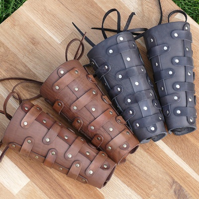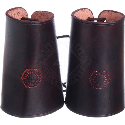 Kvalitní kožené nátepníky zdobené patinovanou mosazí Tyto nátepníky jsou k dostání v černé nebo hnědé barvě Celková délka od lokte k zápěstí 250mm Na obvod předloktí min – max 205 – 260mm Hmotnost 423 g (dohromady) Kvalitní značkový výrobek od Lord Of Battles®