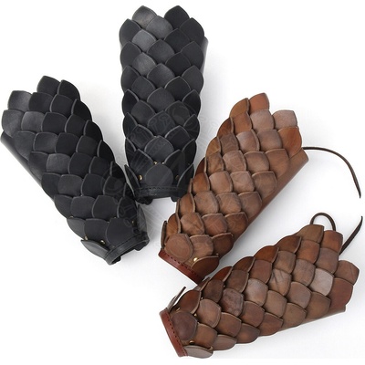 Kožené dračí nátepníky se šupinami K dostání v barvách: černá, hnědá Na vnější stranu nátepníků jsou nanýtovány pokaždé tři řady navzájem se překrývajících kožených šupin...