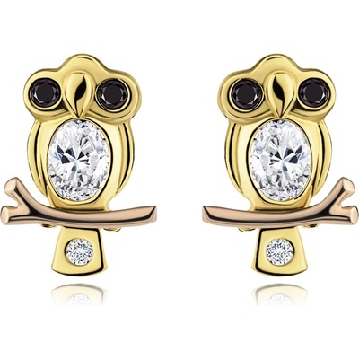 Dvoubarevné náušnice ze 14K zlata, blýskavá sova sedící na lesklé větvičce, černé zirkonové oči, čiré zirkony.