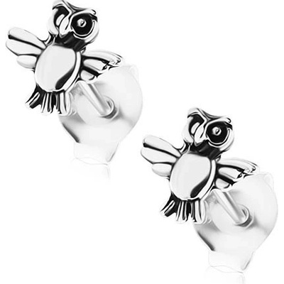 Stříbrné 925 náušnice, symbol moudrosti - sova s lesklým patinovaným povrchem a rozpjatými křídly.