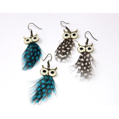 Suprové naušnice znázorňující sovičku, která má místo těla peříčko ♥ Rozměry: 4,5 x 2 cm Materiál: bižutérní kov, pírko