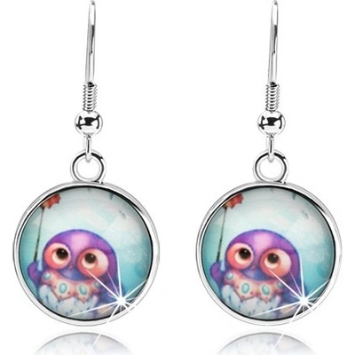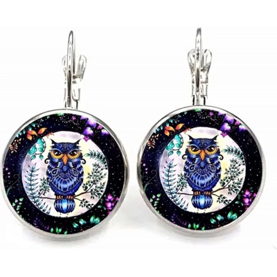 Kabošon náušnice stříbrné barvy, kruh s vypouklým sklem, fialová sovička s náhrdelníkem na modrém podkladu.