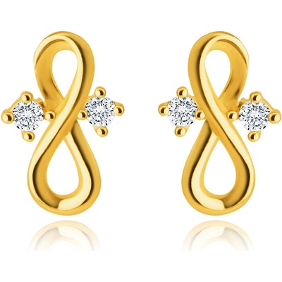 Diamantové zlaté 585 náušnice, lesklá ležatá osmička ze žlutého zlata "INFINITY", třpytivé brilianty v čiré barvě.