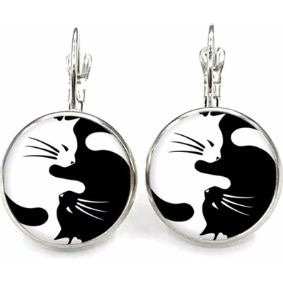 Stylové náušnice Jin Jang Kočka zapínání: visací - na zapínání (na klapku) rozmery: průměr kola: 1,7mm materiál: kov + tvrzené sklo uvedená cena je za pár(2 kusy)