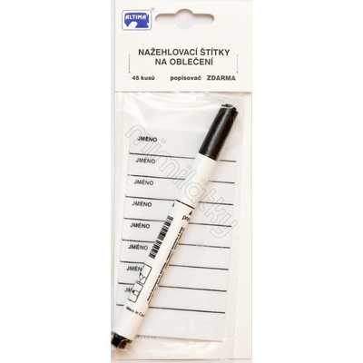 Nažehlovací štítky na oblečení + textilní popisovač. Balení obsahuje 45 štítků.