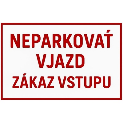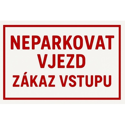 Smaltovaná tabulka o velikosti 297x210 mm se čtyřmi dírami pro připevnění. Cedule má bílý podklad a červený text " Neparkovat vjezd ".
