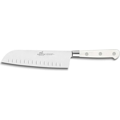Vlastnosti:- nůž Santoku- POM rukojeť- nerezové nýty- materiál: 5Cr15MoV (nerezová ocel)- délka ostří: 18 cm- baleno v krabičceUmění a potěšení z krájení, to je značka nožů...