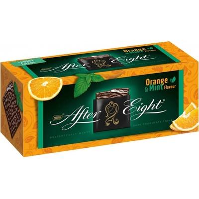 After Eight pralinky 199g Směs peprmintových bonbónů z mléčné a hořké čokoláady. Balení obashuje pralinky: hebký peprmintový fondán s příchutí pomeranče v hořké čokoládě, jemná...