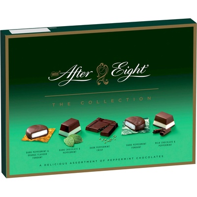 After Eight Nestle 400g Detailní popis produktu Delikátní kombinace tenkých plátků z hořké čokolády naplněné až po okraj lahodnou mátovou náplní. Krásné dárkové balení kvalitní čokolády. Složení: cukr, kakaová hmota, glukózový sirup, kakaové máslo, zahuštěné máslo,...