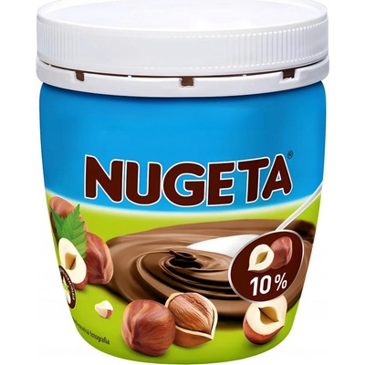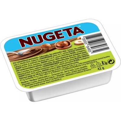 Výtečná lískooříšková pomazánka NUGETA bez palmového oleje v malém balení, ideálním na svačinuSložení: cukr, rostlinné tuky (z ořechů Shea, řepkový), lískooříšková pasta (10 %),...