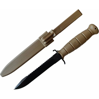 Nůž RAKOUSKÝ GLOCK SURVIVAL FM81 s pilkou HNĚDÝ: - Nůž vyrobený dle vzoru GLOCK SURVIVAL 81, který je používán rakouskou armádou - plastová pochva - celková délka: 29 cm -...