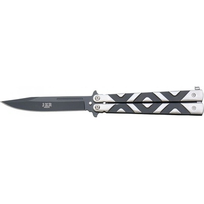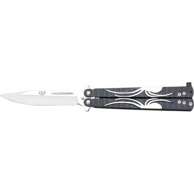 -nůž typu motýlek s ornamentálním vzorem-aluminiová střenka v kombinaci stříbrná a černá jištěná západkou-černěná čepel