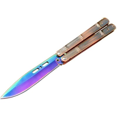 Designově zajímavý motýlek, který zaujme výrazným barevným provedením, prohnutým tvarem a asymetricky uloženou čepelí. Čepel i rukojeť jsou z nerezové oceli s duhovou...