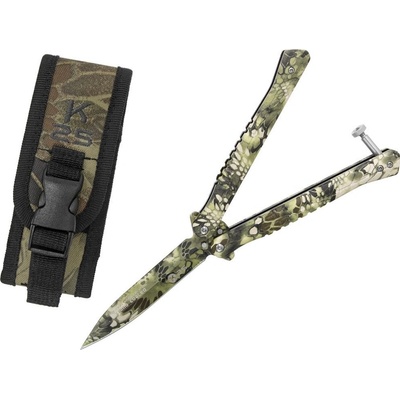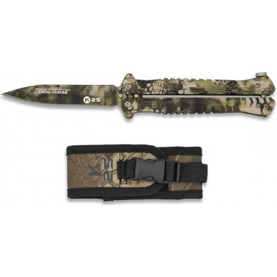 Kovový zavírací nůž, tzv. motýlek od španělské značky K25.Vlastnosti:• otevřete ho (nebo zavřete) jednoduše překlopením dvoudílné rukojeti a zajistíte pojistkou na konci...