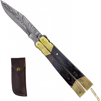 Stylově provedený balisong / motýlek s čepelí vyrobenou z damaškové oceli. Rukojeť s klasickou motýlkovou pojistkou je vyrobená z tmavého dřeva. Nůž nabízí: - zdobenou čepel...