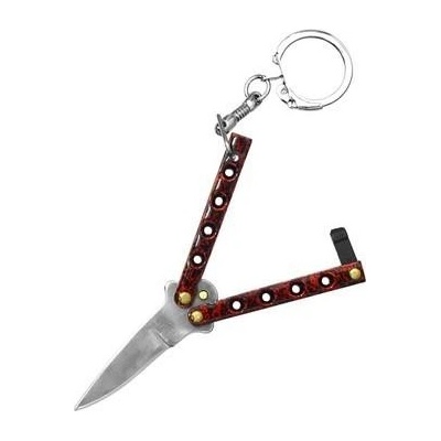 Miniaturný nůž motýlek Haller 84206 červený, určený jako prívěsek na klíče, celokovová konstrukce, čepel dlouhá 4 cm.