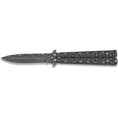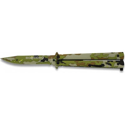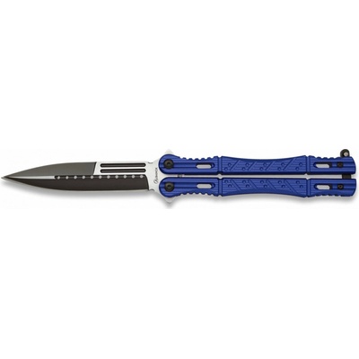 Zavírací nůž ve stylu balisongu, také známém jako motýlek. Jednostranně broušená čepel z nerezavějící oceli a rukojeť ze syntetického materiálu.