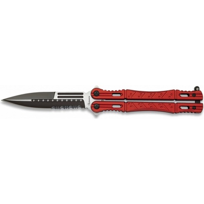-nůž typu motýlek s odlehčovacími otvory-černočervená zbarvená střenka z aluminia jištěná západkou-tréninková čepel bez ostří s odlehčovacími otvory