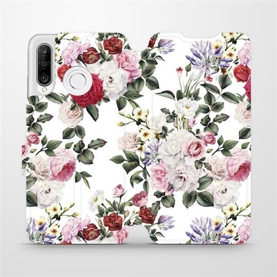 Knížkové pouzdro, obal, kryt Mobiwear na mobil Huawei P30 Lite - MD01S Růže na bílé - ochrana celého telefonu, funkce stojánku, odolná TPU vanička, magnetické zavírání,...