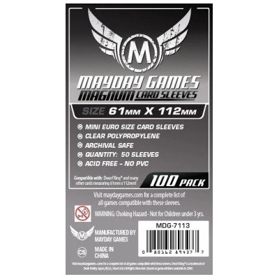 Sada obsahující 100 ks obalů na karty řady Magnum Platinum firmy Mayday, vyrobené speciálně pro hru Dwarf King obsahující karty o rozměrch francouzských tarotů.
