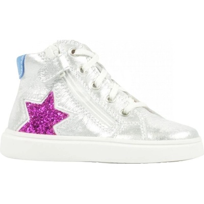 Vysoké tenisky z hladké kůže a efektního materiálu se šněrováním a zipem. Dívčí luxusní kožená obuv z velmi jemné a prodyšné kůže se sametovým povrchem a lesklou aplikací....