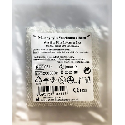 O výrobku Sterilní mastný tyl je vyroben z obvazové textilie S20 - vysoce porézní hydrofobní obvaz z chemickych vláken, určený pro impregnaci léčiv v tekutém nebo masťovém...