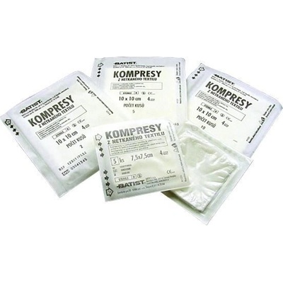 Sterilní kompresy z netkaného textilu. Rozměr 5 x 5 cm. Používají se k všestrannému ošetření ran. Kompresy Batist z netkaného textilu jsou vyrobeny ze směsi 70 % viskózy a 30...