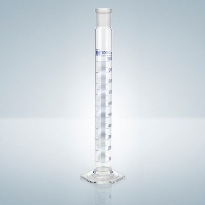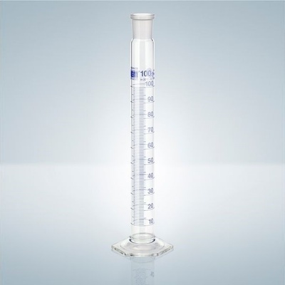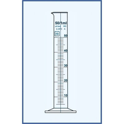 Skleněný odměrný válec: třída A, odpovídá normě ISO 4788 čiré sklo značky DURAN : borosilkátové sklo ve třídě odolnosti proti vodě (hydrolytická třída) HGB:1 DURAN® je registrovaná značka německého výrobce technického skla SCHOTT AG potisk modrou barvou (trvanlivý...