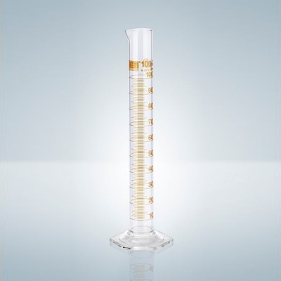 Skleněný odměrný válec: třída B, odpovídá normě ISO 4788 nízký a široký typ čiré sklo značky DURAN : borosilkátové sklo ve třídě odolnosti proti vodě (hydrolytická třída) HGB:1 DURAN® je registrovaná značka německého výrobce technického skla SCHOTT AG potisk hnědou...