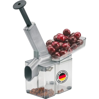 Jednoduchý stolní odpeckovávač višní, s násypkou a odpadní nádobou pro pecky z průhledného plastu. Materiál: Al, plast Provedení: stolní